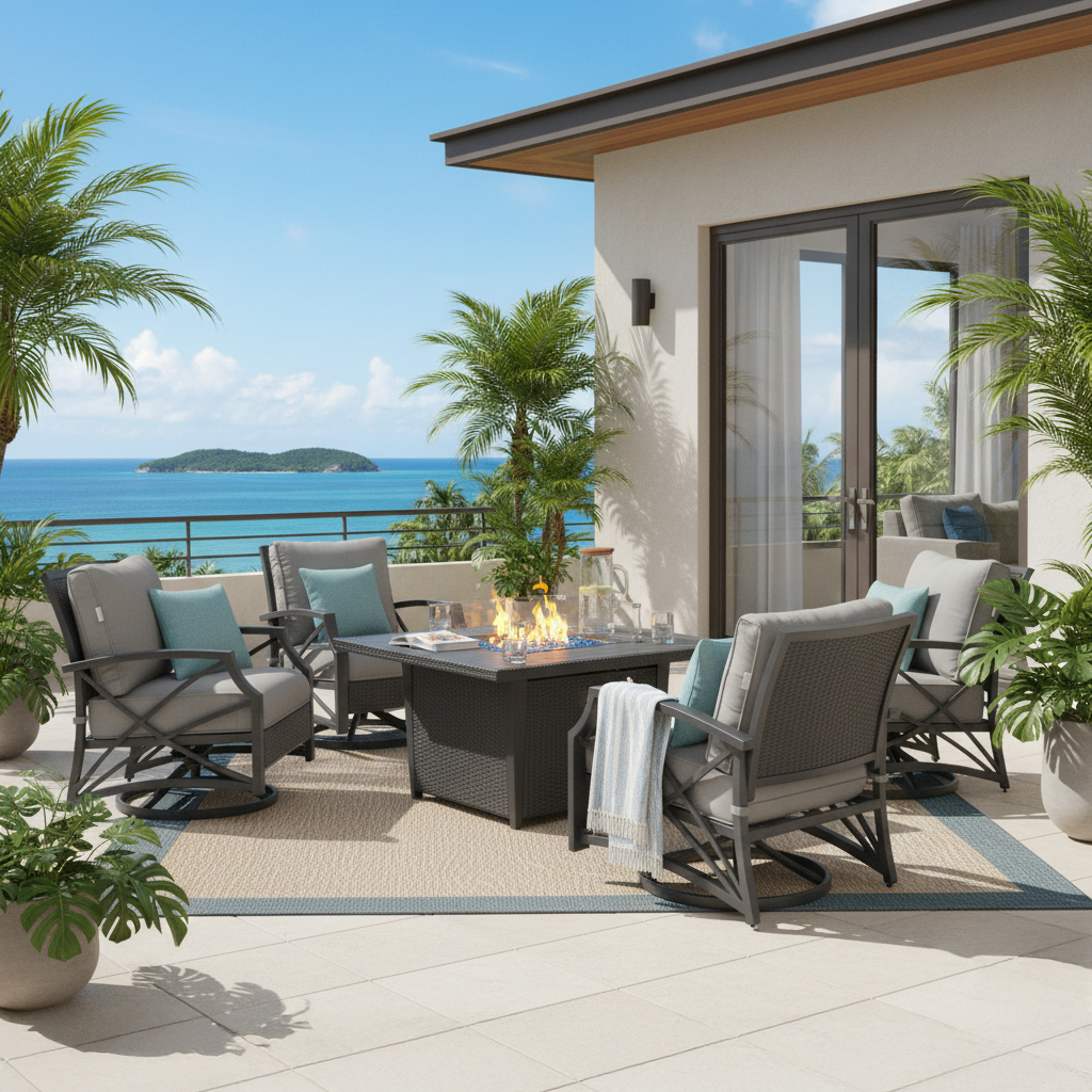 The Ethan 5-Piece 42 Inch Propane Fire Pit Table Set will make your backyard a cozy and stylish retreat! This high-quality gas fire pit patio set is crafted from sturdy powder-coated aluminum and synthetic rattan wicker, to last for many seasons. Transform your fire pit into a dining table with the included burner lid. The push-button ignition system provides convenient control, allowing you to ignite the fire in seconds. Let the inviting atmosphere of this outdoor conversation set captivate your guests.