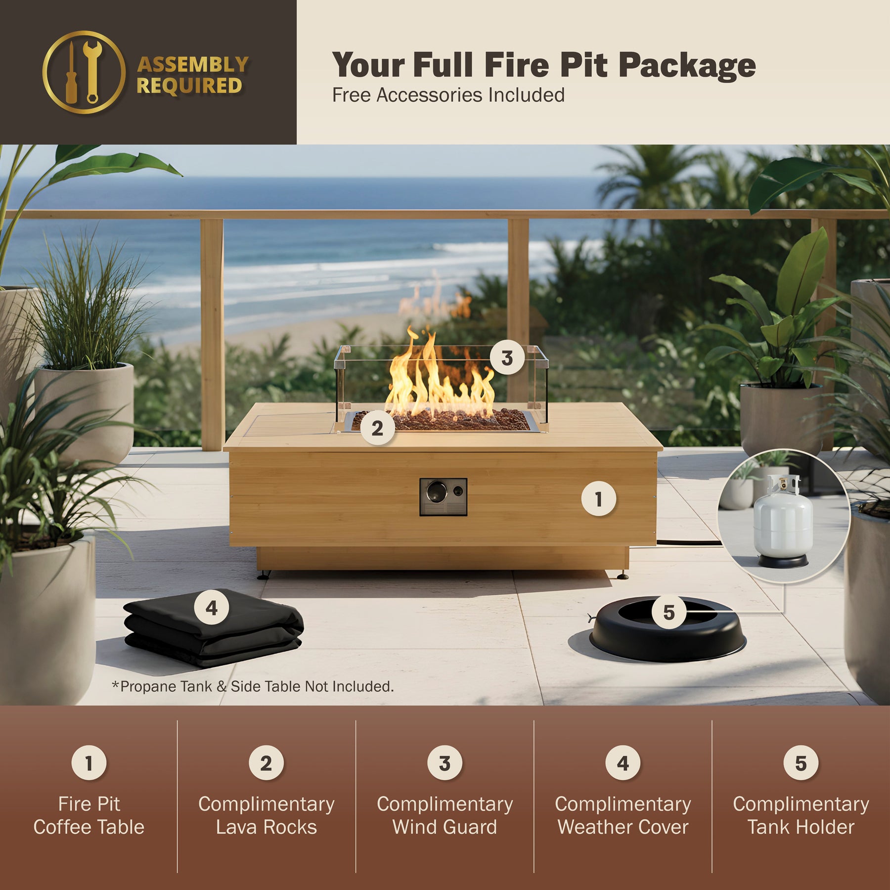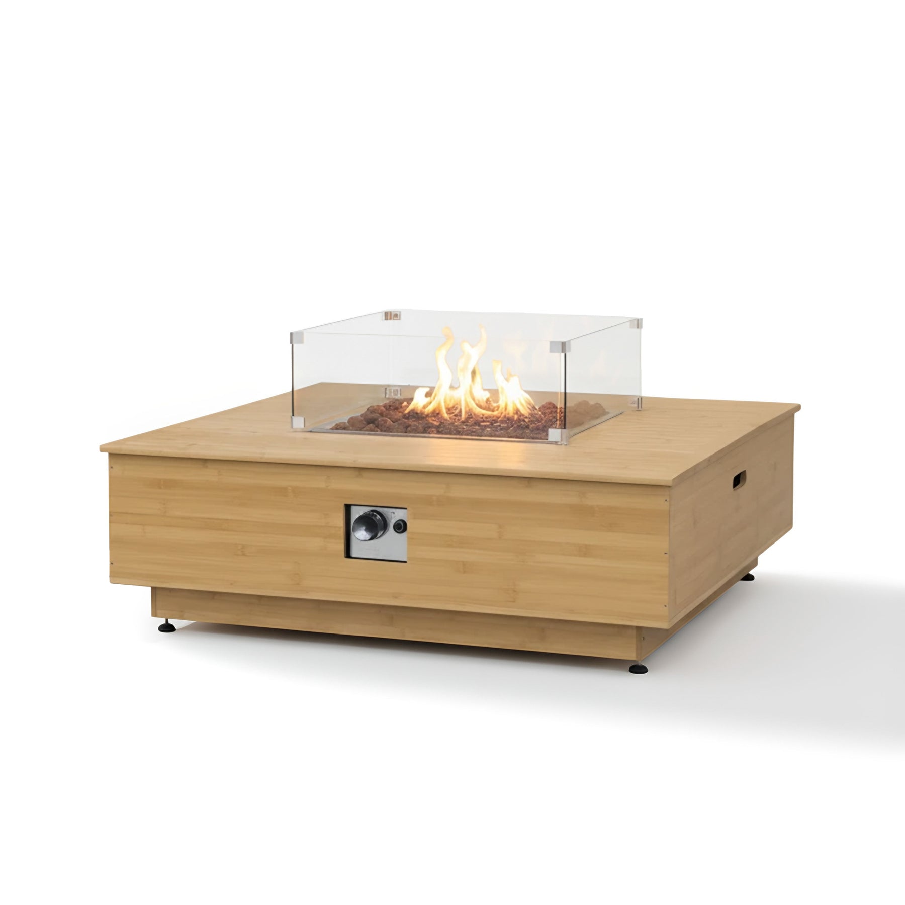 Elevate your outdoor space with the Harmony 43-Inch Bamboo Fire Pit Table. This low-profile fire pit doubles as a spacious coffee table, offering both style and functionality. Enjoy effortless lighting with the push-button ignition, a tempered glass wind guard, and a package of lava rocks for added ambiance. A weather-resistant cover ensures lasting durability. A secure propane tank holder is included.