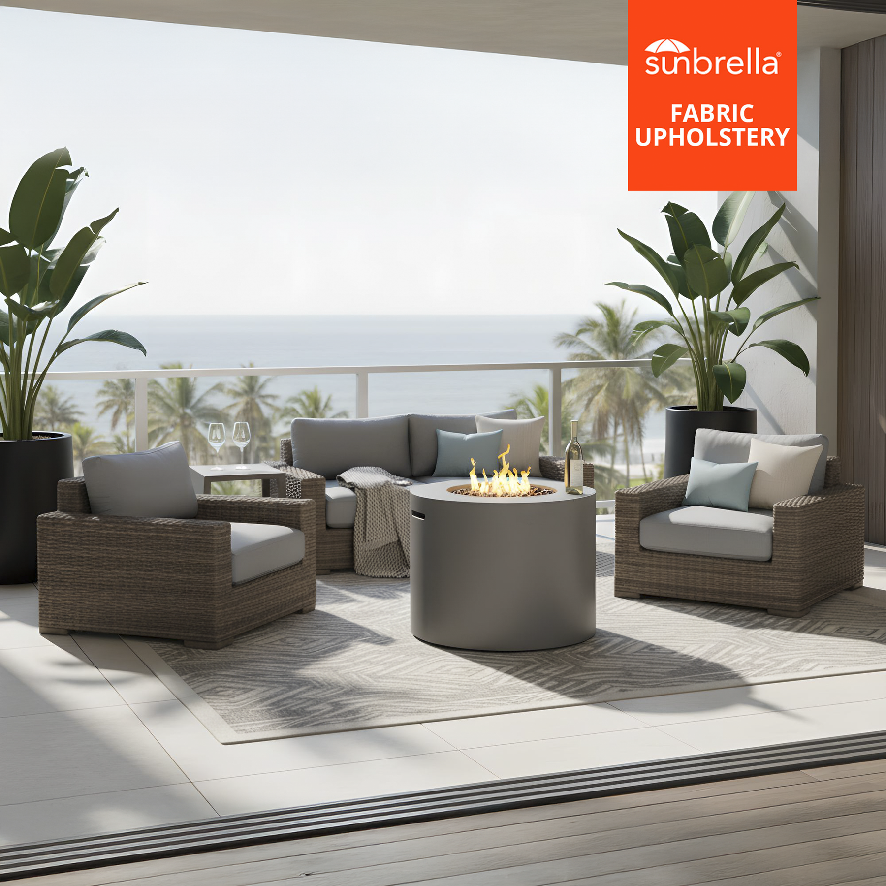 Elevate your outdoor living space with the Loren Patio Set, combining timeless style, lasting comfort, and modern functionality. This 4-piece set includes a 32-inch propane fire pit table, one large loveseat, and two stationary chairs—perfect for relaxing or entertaining on your patio, deck, or garden.