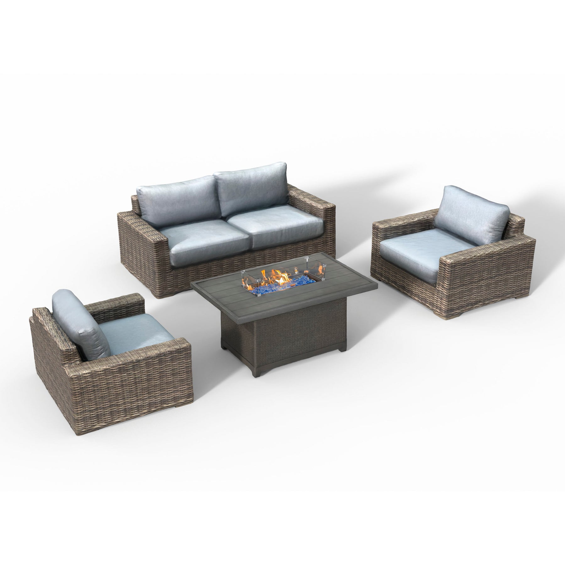 Pairing beautifully with the fire pit are matching handwoven chairs and a spacious loveseat, crafted with the same weather-resistant rattan and rust-resistant aluminum frames. Plush cushions provide lasting comfort, making this the ideal set for patios, decks, or commercial spaces.