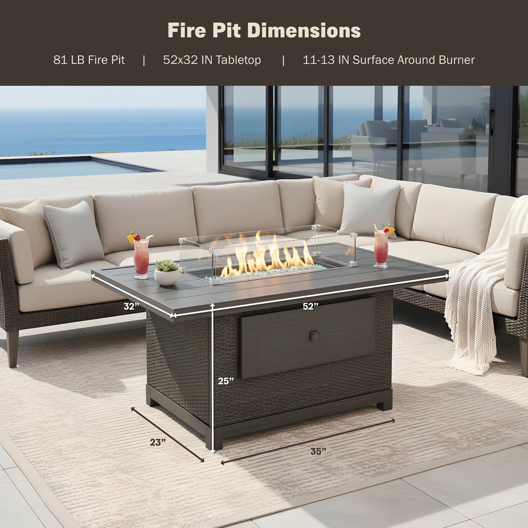 The Novi 5-Piece 52-Inch Propane Fire Pit Table Set will make your backyard a cozy and stylish retreat! This high-quality gas fire pit patio set is crafted from sturdy powder-coated aluminum and synthetic rattan wicker, to last for many seasons. Transform your fire pit into a dining table with the included burner lid. The push-button ignition system provides convenient control, allowing you to ignite the fire in seconds. Let the inviting atmosphere of this outdoor conversation set captivate your guests.
