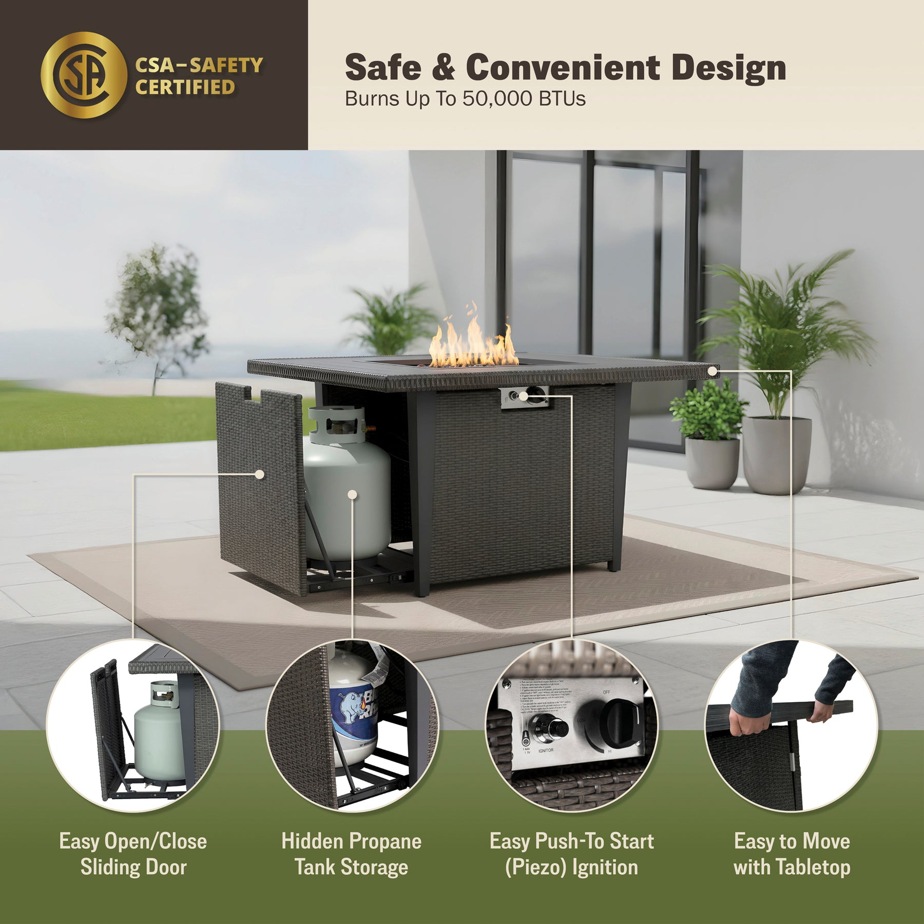 Turn your patio into a warm and stylish escape with the Ethan 4-Piece Outdoor Furniture Set. Centered around the 42-inch Ethan Propane Fire Pit Table, this set blends contemporary charm with lasting performance. Crafted from durable powder-coated aluminum and handwoven synthetic rattan wicker, the fire pit offers 50,000 BTUs of inviting heat—perfect for cozy nights under the stars.