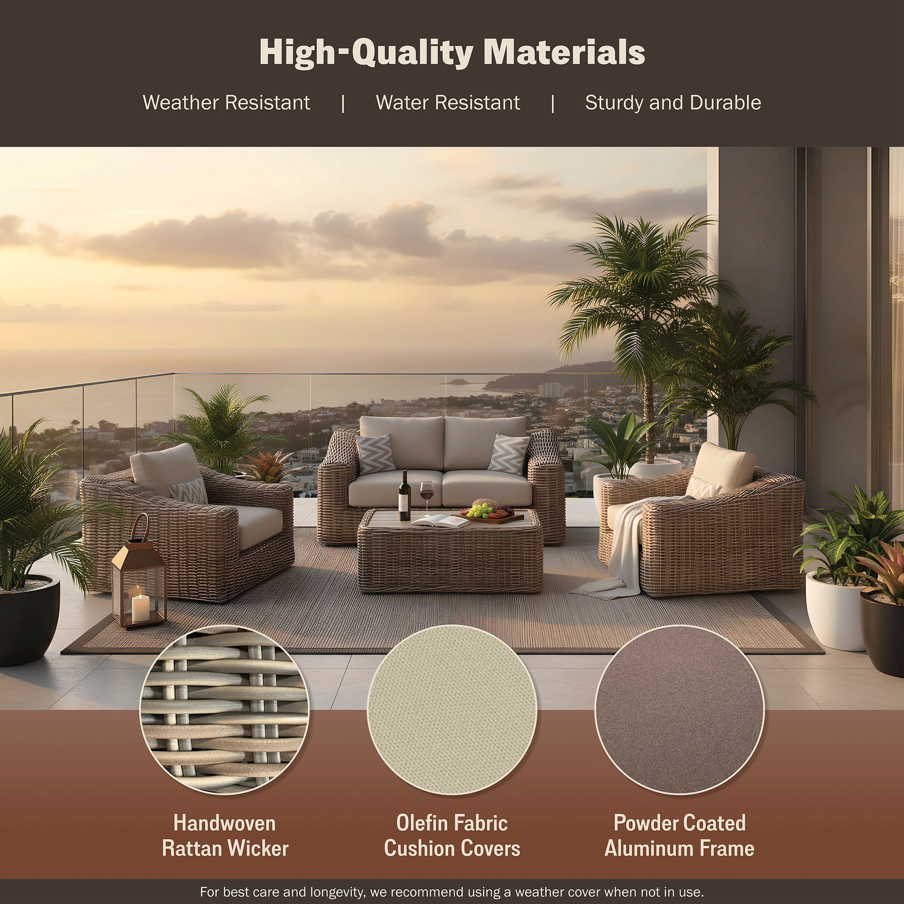 Transform your outdoor space with the Hawaii 4-Piece Wicker Patio Furniture Set, designed for ultimate comfort and lasting durability. This set includes a loveseat, two club chairs, and a coffee table, all featuring a handwoven rattan wicker design that adds a stylish touch to your patio or garden. The powder-coated steel frame ensures robust support, while the poly-wood tabletop offers a modern, low-maintenance surface. The plush 8-inch thick seat cushions, covered in weather-resistant olefin fabric, provide superior comfort, and the machine-washable cushion covers make maintenance a breeze. Perfect for relaxing or entertaining, this set creates an inviting atmosphere for up to four guests. Spot clean for the wicker and enjoy easy care with machine-washable cushions. Best of all, no assembly is required, making it easy to enjoy right away.