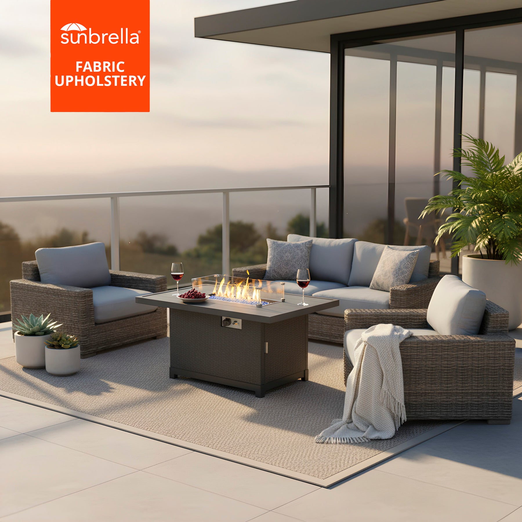 Create a luxurious and inviting outdoor retreat with the Novi 4-Piece Patio Set. Anchored by the 52-inch Novi Propane Fire Pit Table, this set combines modern elegance with durable craftsmanship. The fire pit features a handwoven synthetic rattan wicker exterior and a powder-coated aluminum frame, delivering both style and strength. With 50,000 BTUs of warmth and a CSA-certified design, it’s perfect for relaxing evenings or entertaining guests. The included burner lid seamlessly transforms the fire pit into a functional dining table when the flames are off.