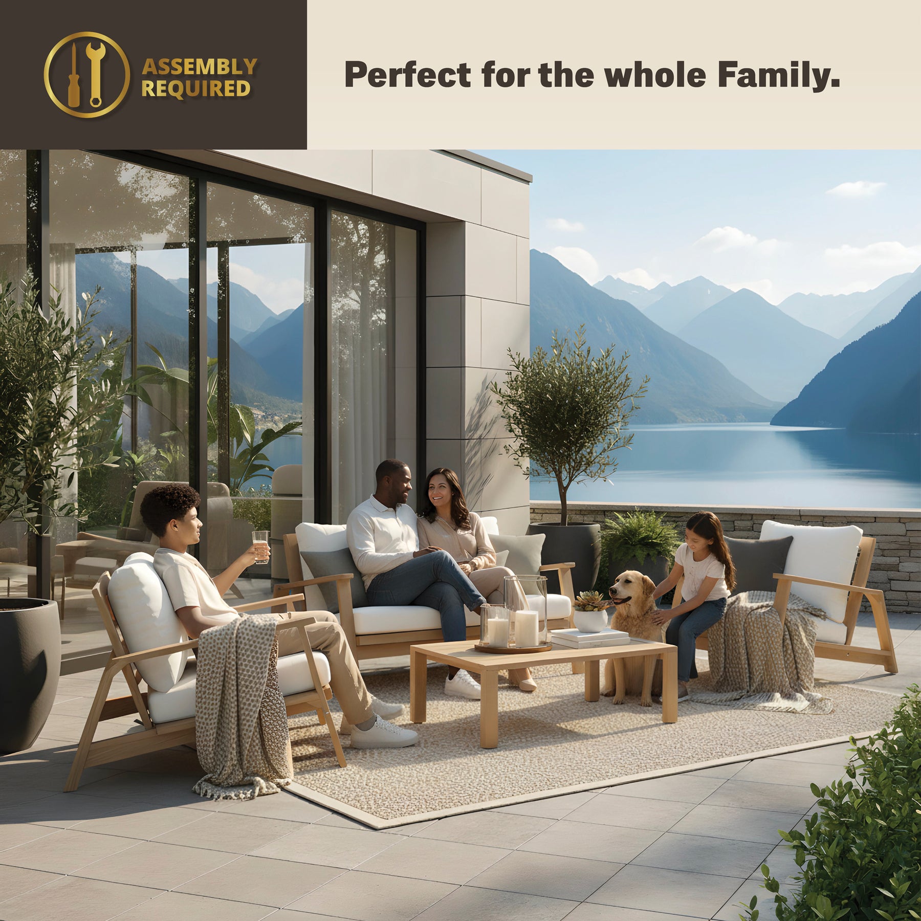 Elevate your outdoor space with the Ciera 4-Piece Acacia Deep Seating Patio Set. Crafted from durable acacia wood, this set combines modern design with lasting strength. The slatted backrest adds a sleek, contemporary touch, while the polypropylene mesh beneath the cushions provides enhanced support and durability. Designed for comfort, the plush 4-inch thick foam cushions are wrapped in machine-washable polyester fabric, making upkeep effortless. This set includes a sturdy coffee table, perfect for hosting drinks, snacks, or décor. Whether you're relaxing solo or entertaining guests, the Ciera Patio Set brings style and functionality to any outdoor setting.