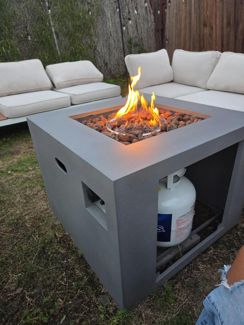Very sleek design, very light in weight and easy to setup. My nephew said it was the most heat he has ever felt from an outdoor firepit. He was tandong about 5 feet tall and felt the warmth. Can't wait to enjoy this winter. Easy to assemble and in the pix you can see where to place the propane. The magnetic cover is easy to hide the propane.