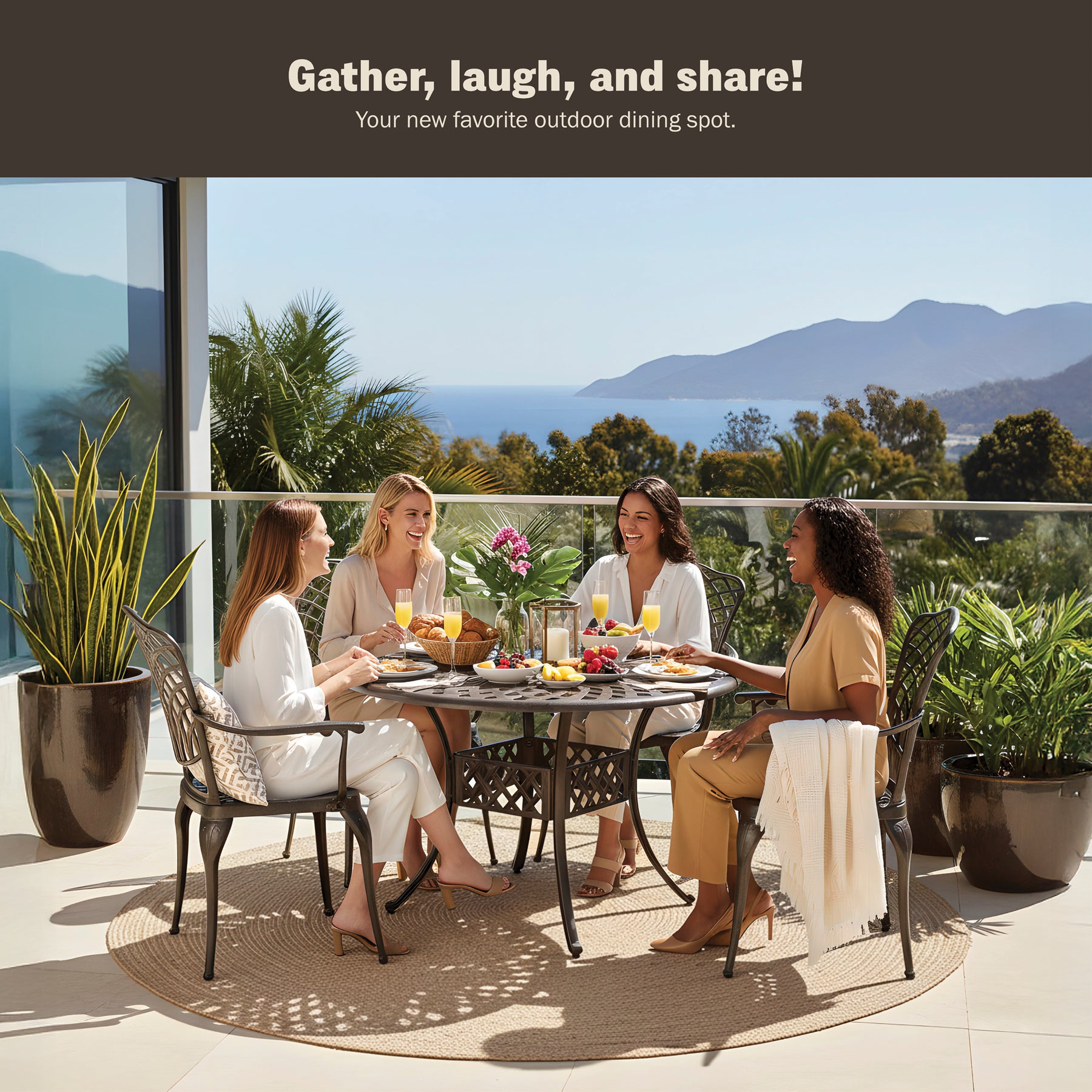 Indulge in an elegant outdoor dining experience with the Kinger Home Arden 5-Piece Outdoor Dining Set. Crafted with a strong cast aluminum frame, this lattice weave-designed patio dining set is both stylish and durable. The round table provides ample dining space and a 2" umbrella hole. Each dining chair boasts a contoured seat and back for support. Pre-installed adjustable foot levelers were included for stability.